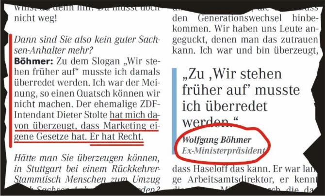 Was Sie als Auftraggeber benötigen, ist das Vertrauen in die Kompetenzen des Fachmanns. Oben stehendes Beispiel verdeutlicht das wie kaum ein Anderes. Sachsen-Anhalts Ministerpräsident Dr. Wolfgang Böhmer war von einer Werbekampagne für sein Land überhaupt nicht überzeugt und disqualifizierte sie sogar als 'Quatsch'. Aber er hatte wider scheinbar besseren Wissens und Gefühls Vertrauen in die Kompetenz eines Menschen, der um die eigenen Gesetze des Marketing weiß und heute sagt Dr. Böhmer: "Er hat Recht."